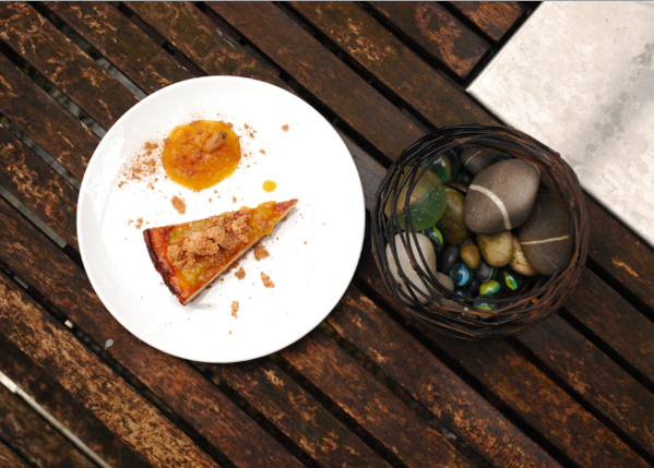 Disporre il composto sopra la torta e decorare con amaretti tritati.