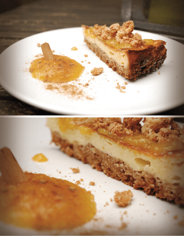 Per la base frantumare i biscotti. Fondere il burro e aggiungerlo ai biscotti insieme con zucchero e alla cannella.