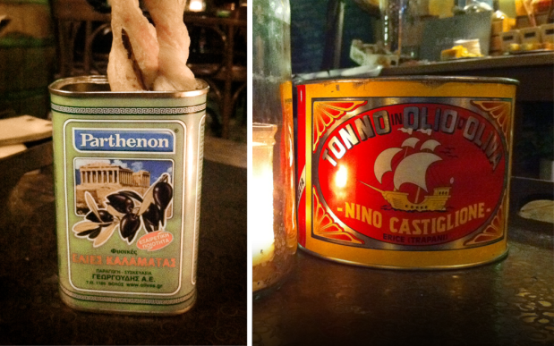 Scatole di latta che diventano portatovaglioli e contenitori per grissini di pasta sfoglia, cassette di pomodori che propongono