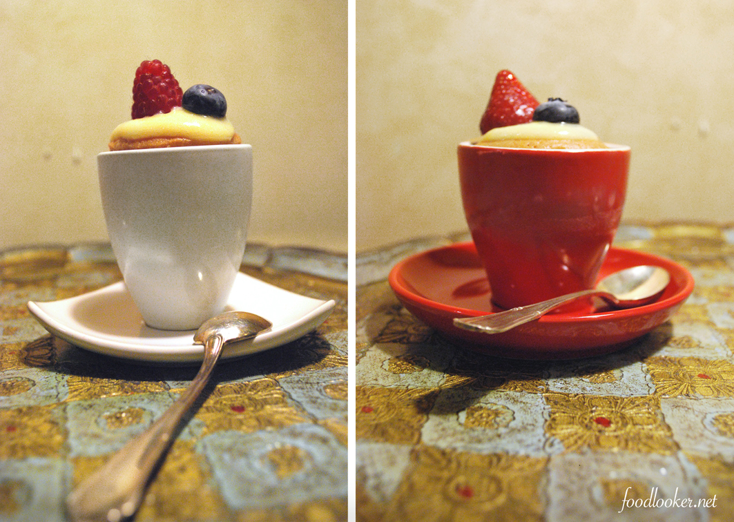 Disponete un po’ di crema pasticcera e qualche fragola o frutti di bosco sopra i muffin. Completate con abbondante zucchero a velo.