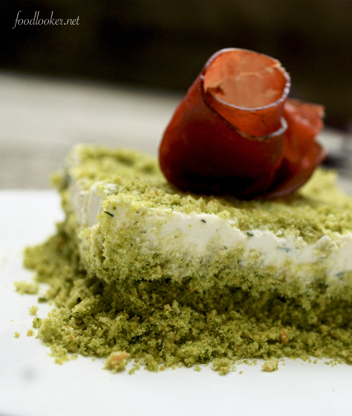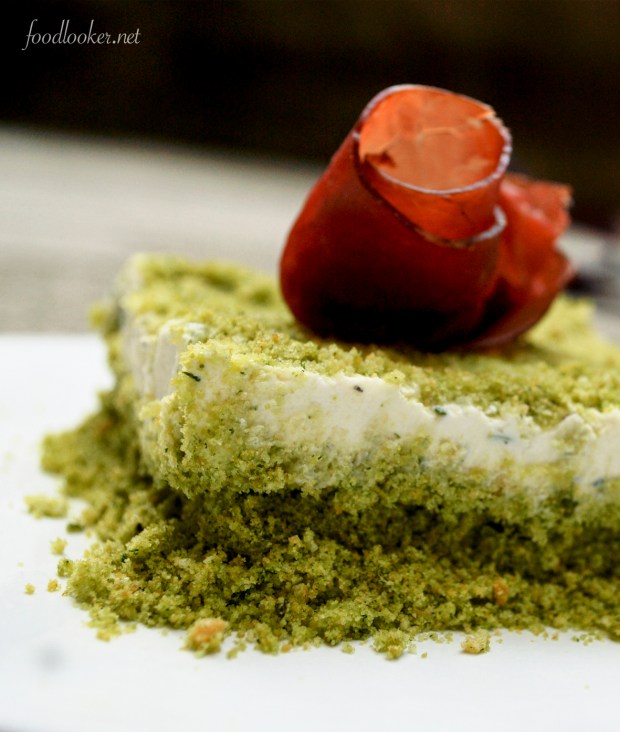 Spezzate i grissini e frullateli con un filo di olio ( molto poco) e il mazzetto di basilico. Una volta che il composto diventerà verde,unite il burro frullando ancora e dividete il composto negli stampini. Tenete un po’ di composto di grissini per la decorazione finale. Fate quindi riposare in frigo. In una ciotola mescolate il philadelphia con la robiola, regolate di sale ed unite la sartoreggia e qualche foglia di origona fresco. Versate il composto negli stampini. Se avete dei coppapasta o degli stampini a cerniera usateli, sarà più facile estrarre il composto per impiattare.