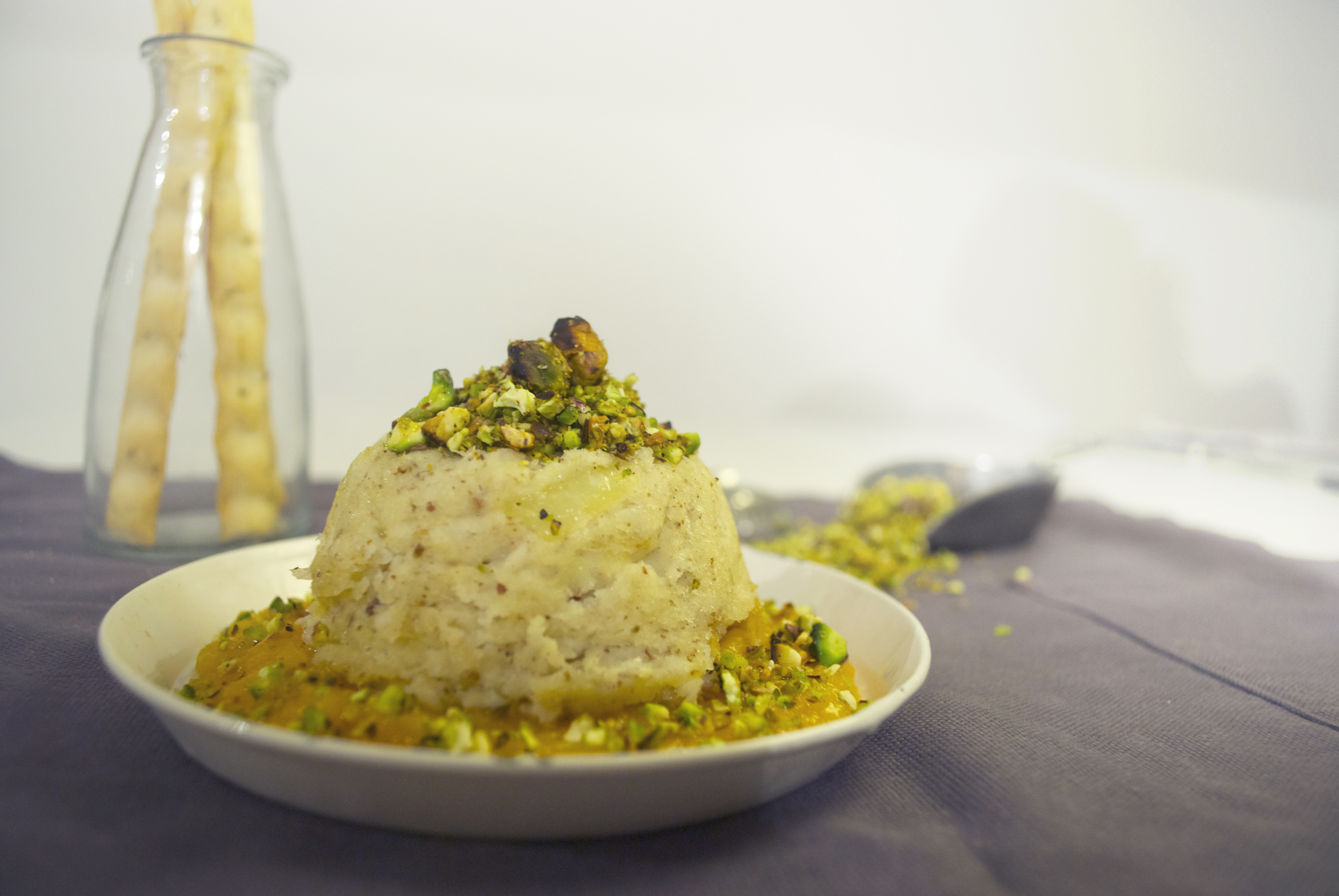 Adagiate il vostro tortino ancora caldo sulla crema di zucca, decorate il piatto con la sbriciolata di pistacchi, sale e pepe ed un filo d’olio a crudo.
